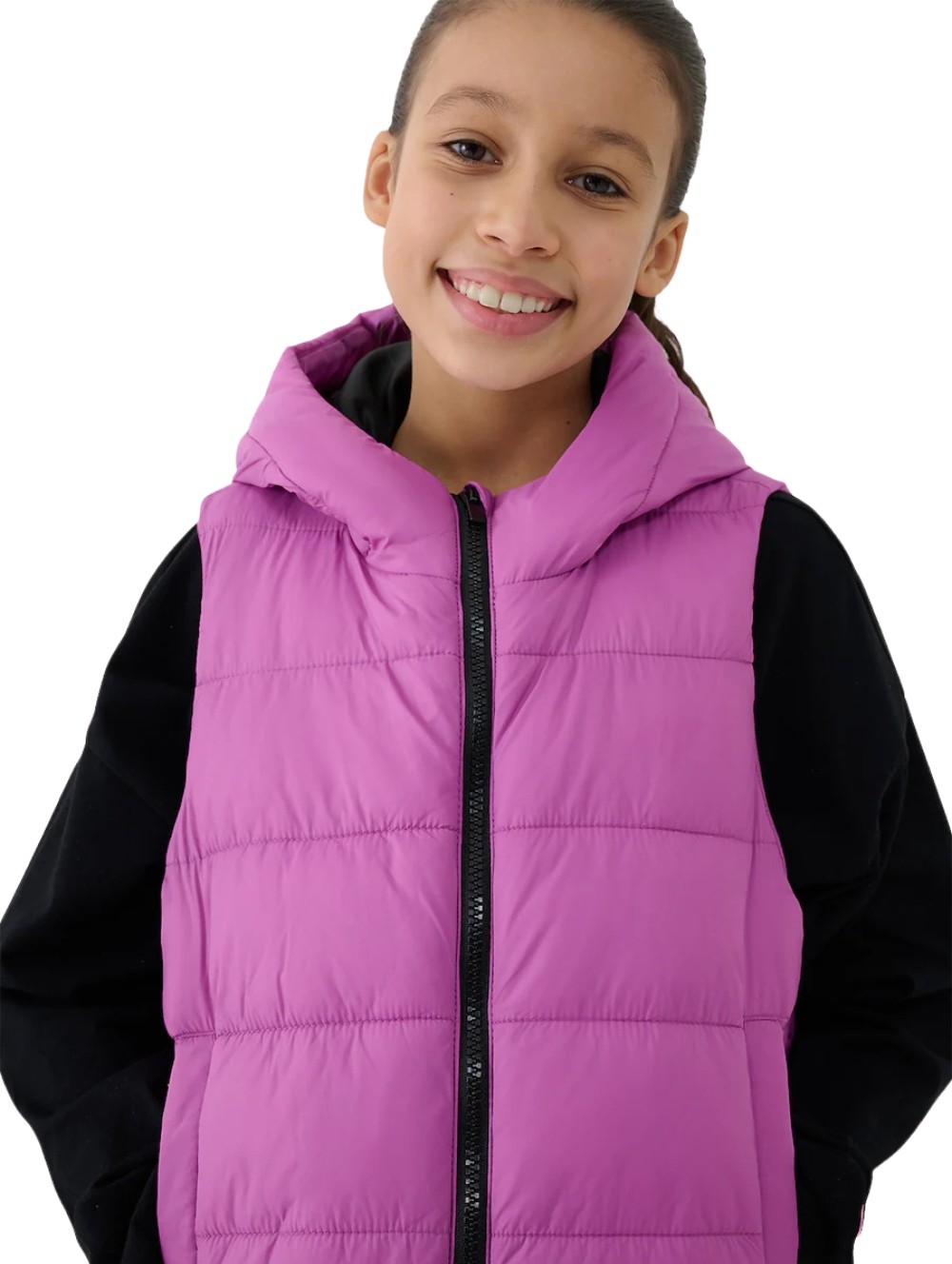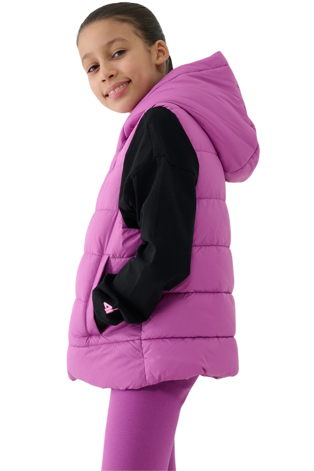 Bezrękawnik puchowy z kapturem dla dziewczynki o optymalnej gramaturze wypełnienia doskonale sprawdzi się zarówno podczas codziennych aktywności, jak i sportu w chłodniejsze dni. Umiarkowana objętość zapewnia skuteczną izolację termiczną bez zbędnego obciążenia, gwarantując komfort cieplny oraz pełną swobodę ruchów w zmiennych warunkach pogodowych.