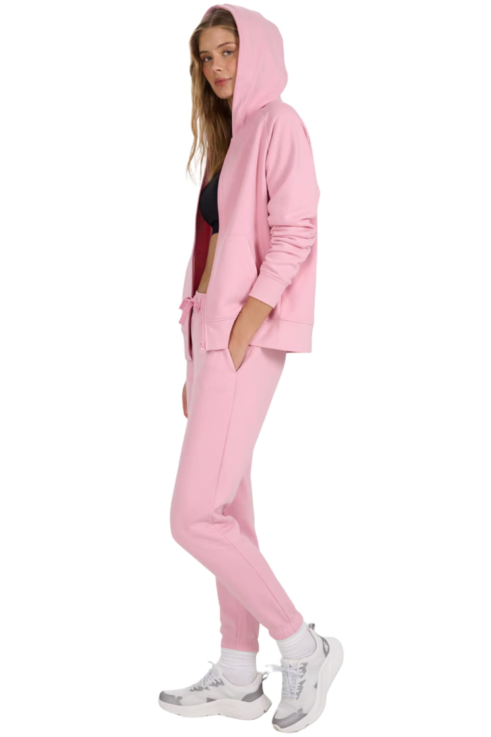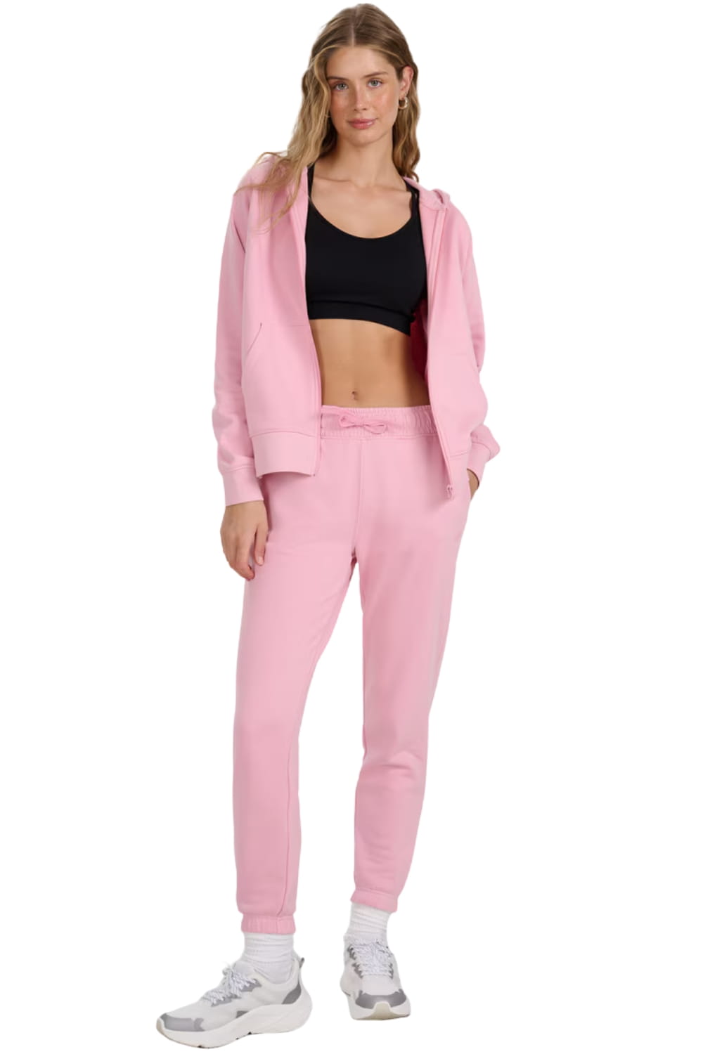 Spodnie uszyto z dzianiny dresowej typu french terry, która z jednej strony jest gładka, a z drugiej ma charakterystyczny pętelkowy splot. Taki materiał jest miękki, lekki, bardziej lejący i przyjemny w dotyku, idealny na cieplejsze dni. Gramatura 280 gsm zapewnia dobrą przewiewność i komfort noszenia.